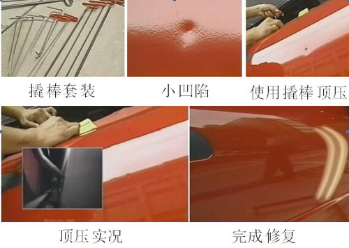 對于鋁板上的小凹陷,可以使用日照燈尋找凹陷點,再用撬棒頂壓法,從板件內側慢慢往外頂,但要注意不能過度頂壓,如圖1-91所示為撬棒頂壓法實例圖。