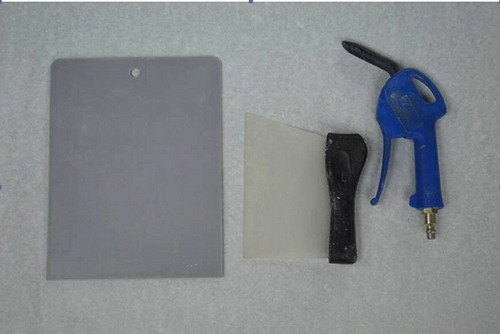 原子灰刮涂工藝中要使用調(diào)灰板、刮刀、吹塵槍等工具。如圖2-29所示