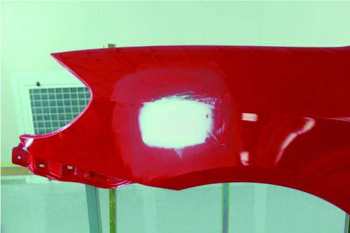 ②指刮法。在原子灰干燥過程中,可以用手指甲輕輕地刮原子灰邊緣薄的部分,檢查原子灰是否已經(jīng)干透。如果沒有干透,則在指甲上會(huì)粘有原子灰;如果已經(jīng)干透,則指甲不會(huì)粘上原子灰,并在原子灰上出現(xiàn)堅(jiān)硬的白色痕跡。如圖2-53所示。