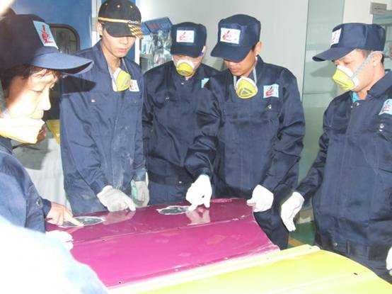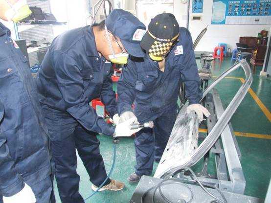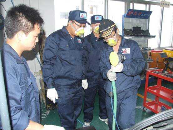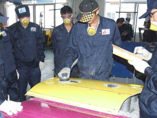 老師們實操磨灰機進行車身修復(fù)