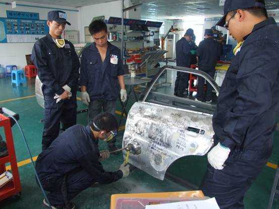 老師們使用鈑金工具套裝進行修復(fù)車身的練習(xí)